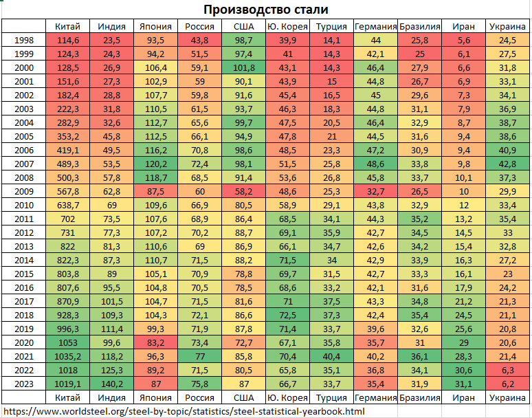 Всемирная ассоциация производителей стали, собирающая данные по 71 стране мира опубликовала пресс-релиз результатов 2023 года.