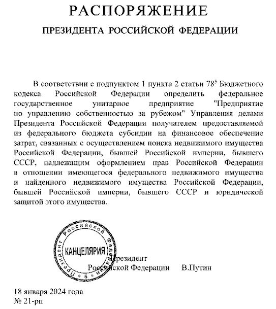 Президент России Владимир Путин подписал распоряжение о поиске и оформлении прав нашей страны на все имущество Российской Империи и СССР, ныне оказавшееся за рубежом.