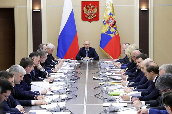 На фото: президент РФ Владимир Путин (в центре) во время заседания с членами правительства РФ.