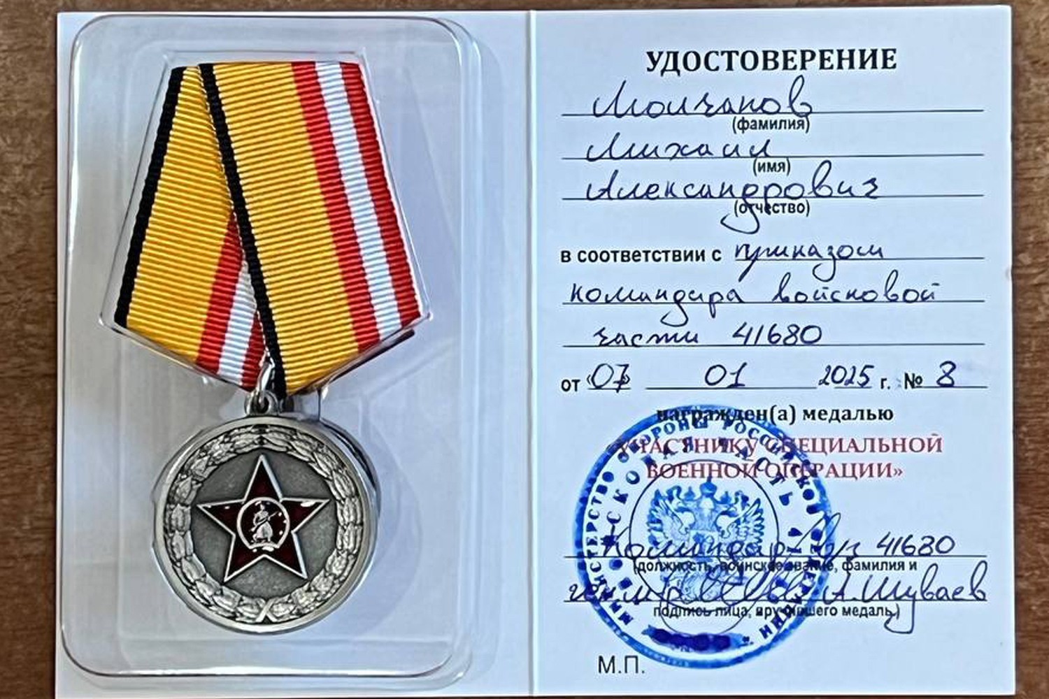 За внесенный вклад и помощь приказом командира войсковой части координатор Хакасского РО ЛДПР, заместитель Председателя Верховного Совета Хакасии Михаил Молчанов награжден медалью Министерства обороны Российской Федерации «УЧАСТНИКУ СПЕЦИАЛЬНОЙ ВОЕННОЙ ОПЕРАЦИИ».