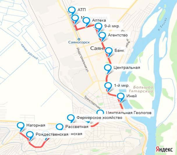 - в прямом направлении: рейс из г. Саяногорска: АТП, Молокозавод, Аптека, 9-й микрорайон, «Агентство», Банк, Центральная Саяногорск, 5-й микрорайон, Магазин Иней, Центральная Геологов, Мира Геологов, Фермерское хозяйство, Рассветная, Воздвиженская, Рождественская, Нагорная