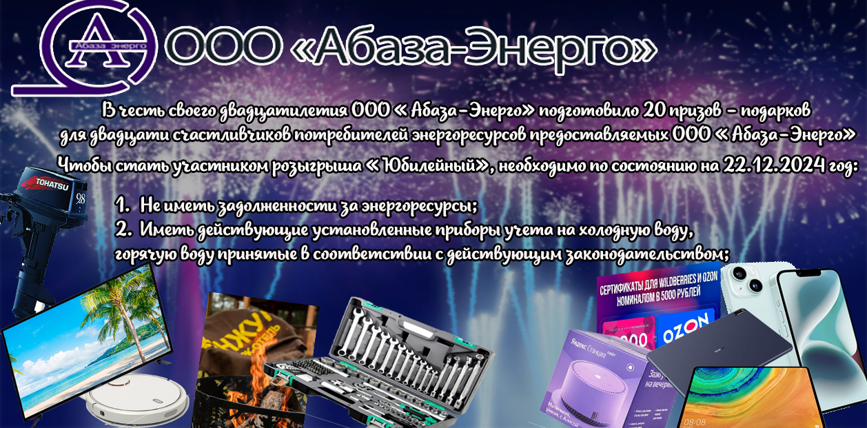 Выполнение этих условий дает право на участие в розыгрыше. Итоги будут подведены 25 декабря 2024 года с использованием генератора случайных чисел. Призы будут вручаться в управлении ООО «Абаза - Энерго» по адресу: город Абаза, улица Гагарина, 2А, согласно Положению о проведении стимулирующего розыгрыша «Юбилейный».