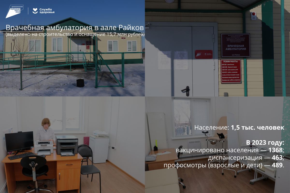 Всего в аале Райков проживает 1,5 тысячи человек. В амбулатории ведётся профилактическая и лечебная работа с детским и взрослым населением, в том числе из близлежащих населенных пунктов - аалов Шурышев и Баинов, поселка Хоных.