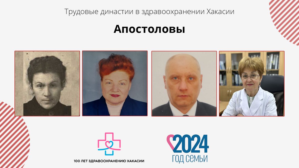 Основатель династии – бабушка заместителя главного врача по лечебной работе Республиканского центра профилактики и борьбы со СПИД Веры Шишкиной, ветеран медицины Анна Апостолова. Её фамилия была хорошо известна многим жителям Славянска старшего поколения. Она работала врачом-педиатром, заведующей городской детской консультацией, заведующей детским инфекционным отделением, главным врачом детской больницы.